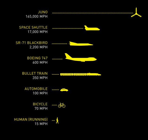 When arriving at Jupiter, the planet's gravity pulls in Juno faster and faster until the spacecraft reaches a speed over 250,000 kilometers per hour (150,000 miles per hour) with respect to Earth – making it one of the fastest human-made objects ever. When it arrives at Jupiter, it slams on the brakes, firing its main engine in reverse. After slowing down, Juno can then enter Jupiter orbit.