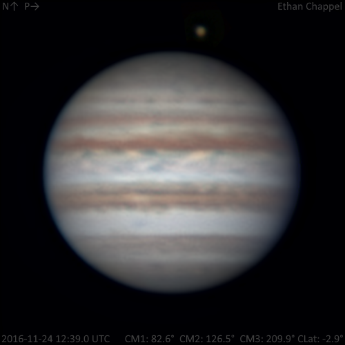 Slightly better conditions for this image than I had on November 20th. The North Temperate Belt is orange with some gray on the northern edge. The North Equatorial Belt is fairly dark while the South Equatorial Belt is a lighter shade. South of the SEB is the STB Spectre, located just before the Central Meridian. Callisto appears above the north pole of Jupiter, though it's actually about 1.9 million kilometers in front of the planet. Due to the way I processed it, the moon may be brighter in the image than in reality.