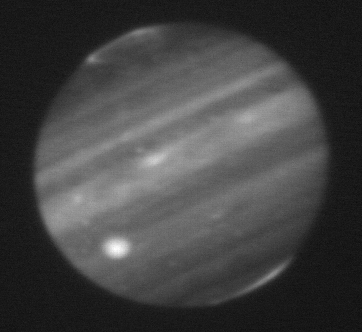 3.80-micron (L' filter) observation of Jupiter taken by the staff of NASA's Infrared Telescope Facility (IRTF) using the guide camera of the SpeX facility infrared spectrometer as a part of a program to characterize atmospheric variability in Jupiter to support the Juno mission. This filter is sensitive to sunlight reflected from clouds as deep as 1 bar, plus some additional radiation from H3+ aurora toward the poles.