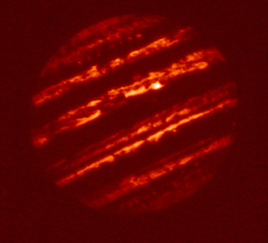 5.10-micron filtered image of Jupiter taken by the staff of NASA's Infrared Telescope Facility (IRTF) using the guide camera of the SpeX facility infrared spectrometer as a part of a program to characterize atmospheric variability in Jupiter to support the Juno mission. This filter is sensitive to very little sunlight reflected from clouds, but mostly to thermal emission from clouds as deep or deeper than the 2-3 bar pressure level. In case of "duplicate" images, this is the final version.