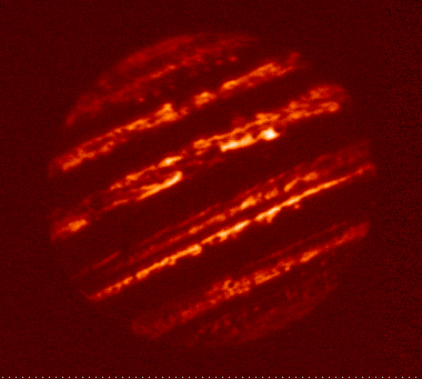 5.10-micron filtered image of Jupiter taken by the staff of NASA's Infrared Telescope Facility (IRTF) using the guide camera of the SpeX facility infrared spectrometer as a part of a program to characterize atmospheric variability in Jupiter to support the Juno mission. This filter is sensitive to very little sunlight reflected from clouds, but mostly to thermal emission from clouds as deep or deeper than the 2-3 bar pressure level. In case of "duplicate" images, this is the final version.