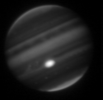 2.16-micron observation of Jupiter taken by the staff of NASA's Infrared Telescope Facility (IRTF) using the guide camera of the SpeX facility infrared spectrometer as a part of a program to characterize atmospheric variability in Jupiter to support the Juno mission. Image taken through cirrus.