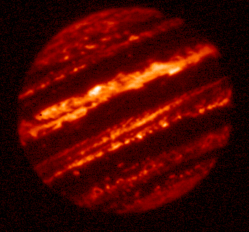 5.10-micron filtered image of Jupiter taken by the staff of NASA's Infrared Telescope Facility (IRTF) using the guide camera of the SpeX facility infrared spectrometer as a part of a program to characterize atmospheric variability in Jupiter to support the Juno mission. This filter is sensitive to very little sunlight reflected from clouds, but mostly to thermal emission from clouds as deep or deeper than the 2-3 bar pressure level.