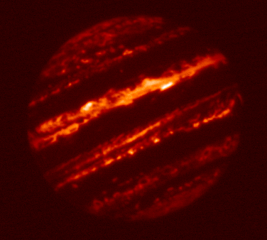 5.10-micron filtered image of Jupiter taken by the staff of NASA's Infrared Telescope Facility (IRTF) using the guide camera of the SpeX facility infrared spectrometer as a part of a program to characterize atmospheric variability in Jupiter to support the Juno mission. This filter is sensitive to very little sunlight reflected from clouds, but mostly to thermal emission from clouds as deep or deeper than the 2-3 bar pressure level.