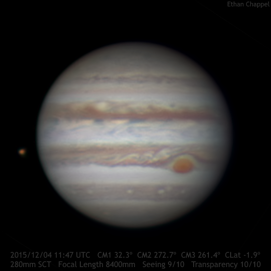 After a long two months and seven days of heavy clouds, some rain, and consistently bad seeing, I finally got great seeing! The GRS is very red and the NEB is turbulent ahead of WSZ. I had to reconstruct the color channels for Io so it may be a few pixels out of position.