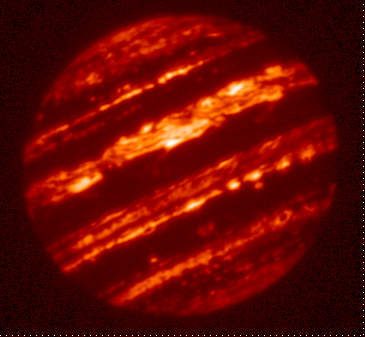 5.10-micron filtered image of Jupiter taken by the staff of NASA's Infrared Telescope Facility (IRTF) using the guide camera of the SpeX facility infrared spectrometer as a part of a program to characterize atmospheric variability in Jupiter to support the Juno mission. This filter is sensitive to very little sunlight reflected from clouds, but mostly to thermal emission from clouds as deep or deeper than the 2-3 bar pressure level.