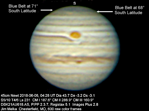 Blue belt recorded in South Polar region of Jupiter is thought to be an aurora belt.