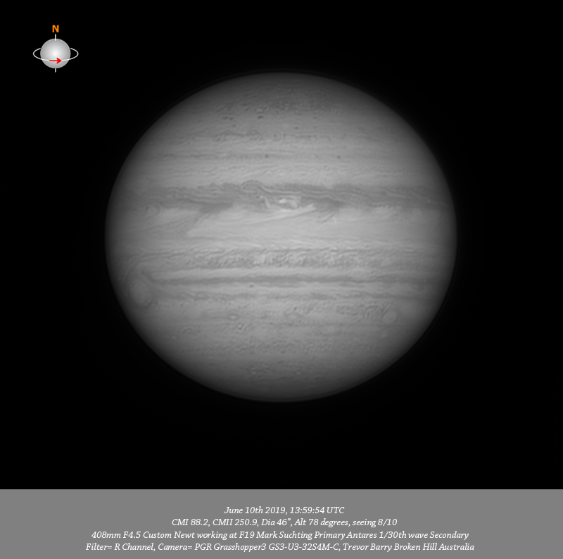 R channel data. Jupiter at opposition. Very hi-res particularly down the down stream structure from the material ejected from the eye of the GRS.