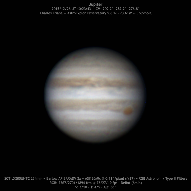 2015/12/26 UT 10:23:43 CM=209.2°/282.2°/276.8° SCT LX200UHTC 254mm + Barlow AP BARADV 2x + RGB Astronomik Type II Filters + ASI120MM @ 0.11”/pixel (f/27) RGB: 2267/2701/1894 frames @ 22/27/19 fps – DeRot (6min) S: 3/10 – T: 4/5 – Alt: 88° Charles Triana - AstroExplor Observatory - Colombia www.astroexplor.org