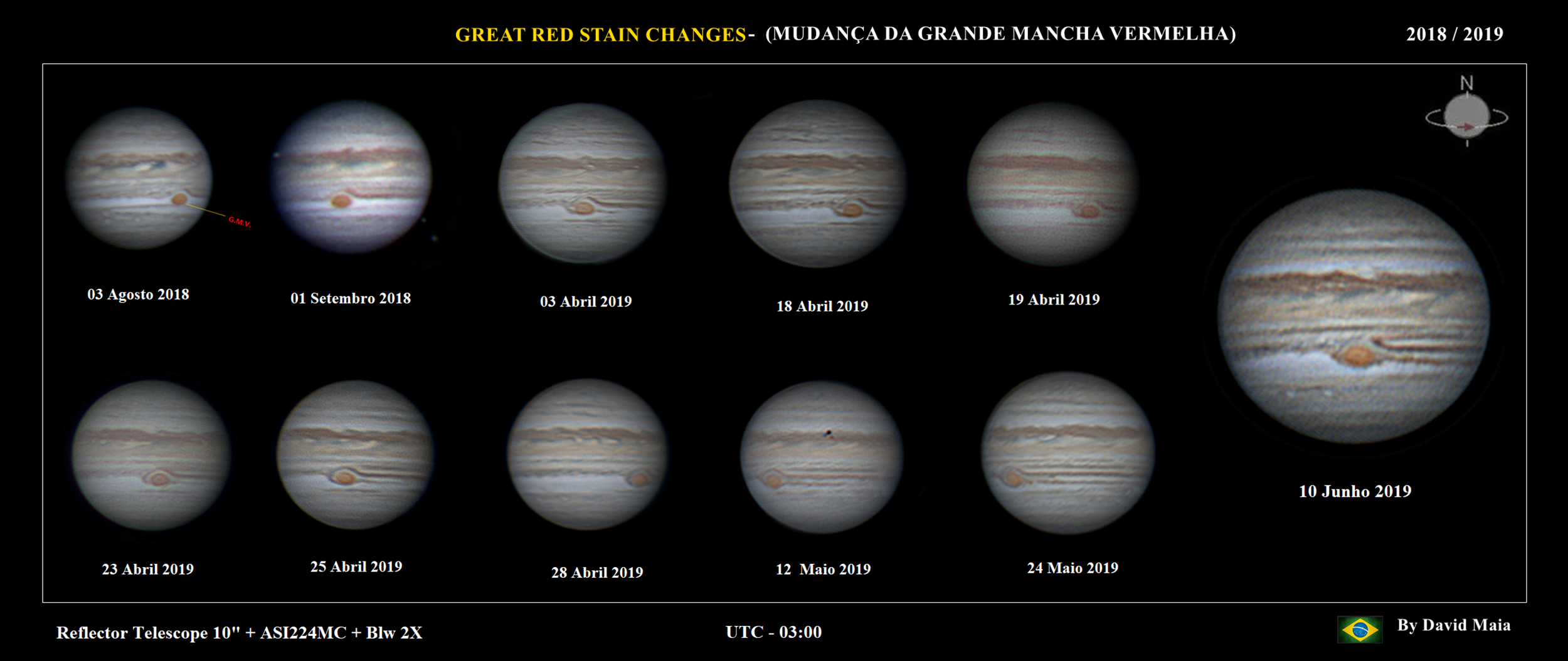 Jupiter astrophotographs from August 2018 to June 2019, sudden changes in the great gas giant's hurricane on the Great Red Macha;