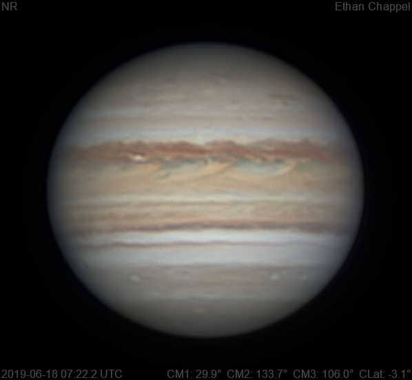 After imaging Saturn, I decided to return to Jupiter to capture more images, something I hardly do. I found improved seeing conditions upon my return. Notes: A bright outbreak on the North Equatorial Belt is east of the central meridian. The Equatorial Zone is orange, except the southern edge. Oval BA is rising. The South Polar Red Spot is near the CM.