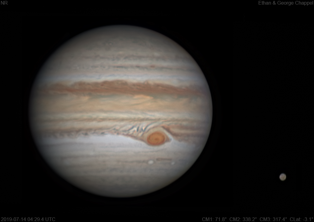 Finally, a night that wasn't too breezy for the CGEM DX and C14. I thought the seeing was only a little above average while recording, but it turned out to be excellent. Notes: The EZ is orange, with the exception of the southernmost edge. The SEBn trailing the GRS is whiter than the EZ. The SEBs is clumpy. The GRS hollow appears to be pulling in white clouds from the STB, making the GRS look partially detached from the SEB. Two SEB rings are east of the GRS. White Oval Z is about to set. The faint STB Spectre is 48,000 km long. The eastern end is south of the GRS. Ganymede is presenting its Jovian-facing hemisphere, with the bright Tros impact crater near the western limb.