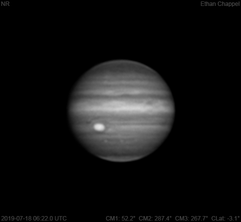 An excellent night for planetary imaging, with the usual caveat of being too breezy for using the CGEM DX/C14. Notes: The North North Temperate Belt is full of dark clouds. The North Temperate Belt also has dark clouds. The Great Red Spot is approaching the central meridian. The GRS wake has no bright outbreaks.