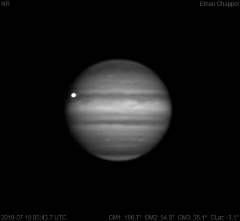 Another good summer night of imaging for the AVX/C8. Notes: The South Equatorial Belt is dark and clumpy on the southern edge. The mid-SEB is light. Io is beginning its transit across Jupiter.