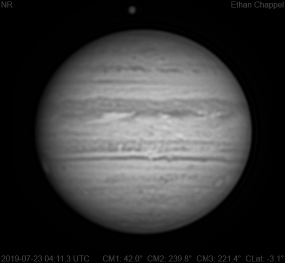 Another amazing summer night of imaging with the AVX/C8. Notes: White Oval Z is rising. The Great Red Spot, on the western limb, is also rising. Oval BA is approaching the western limb. Callisto is passing by. It will resume transits and occultations in November.