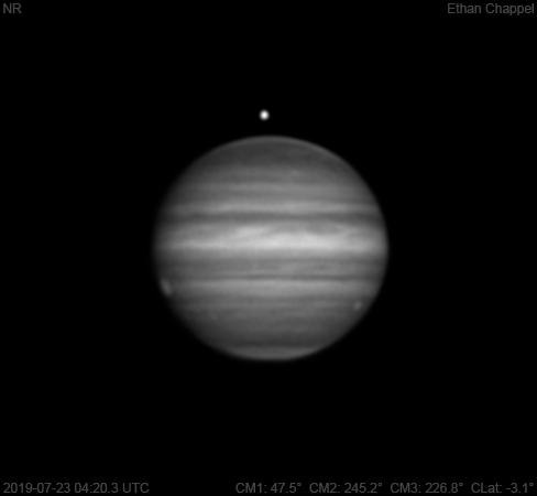 Another amazing summer night of imaging with the AVX/C8. Notes: White Oval Z is rising. The Great Red Spot, on the western limb, is also rising. Oval BA is approaching the western limb. Callisto is passing by. It will resume transits and occultations in November.
