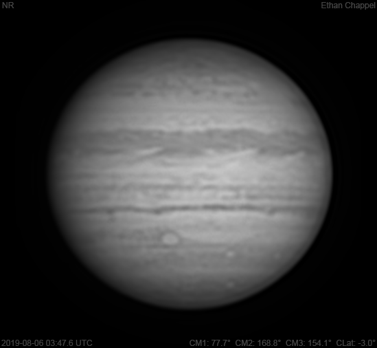 A night of great conditions aside from a slight breeze. Notes: The NEBn has a couple ovals. The EZs has a northern boundary splitting it from the rest of the zone. In visible light, this is where the transition from orange to white occurs. Oval BA and the STB Ghost are approaching the central meridian. Two streaks on the South Temperate Belt are approaching the eastern limb. Are these new structured segments? The rising half of the SEBn is mottled. The SEBs is dark. The South Polar Red Spot is past the central meridian.