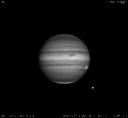 A decent return to imaging Jupiter after missing a few to bad weather. Notes: The northern Equatorial Zone has a hot-spot past the central meridian. The northern South Equatorial Belt is pale. The Great Red Spot is setting. Callisto is approaching Jupiter.