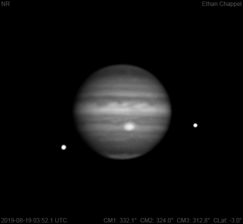 The best conditions for imaging I've had with the C8 so far this summer, although it got a little worse by the time I got to recording methane data. Notes: The southern edge of the Equatorial Zone is darker than the rest of the zone. The Great Red spot is front and center. Io is approaching occultation as Ganymede emerges from behind Jupiter.
