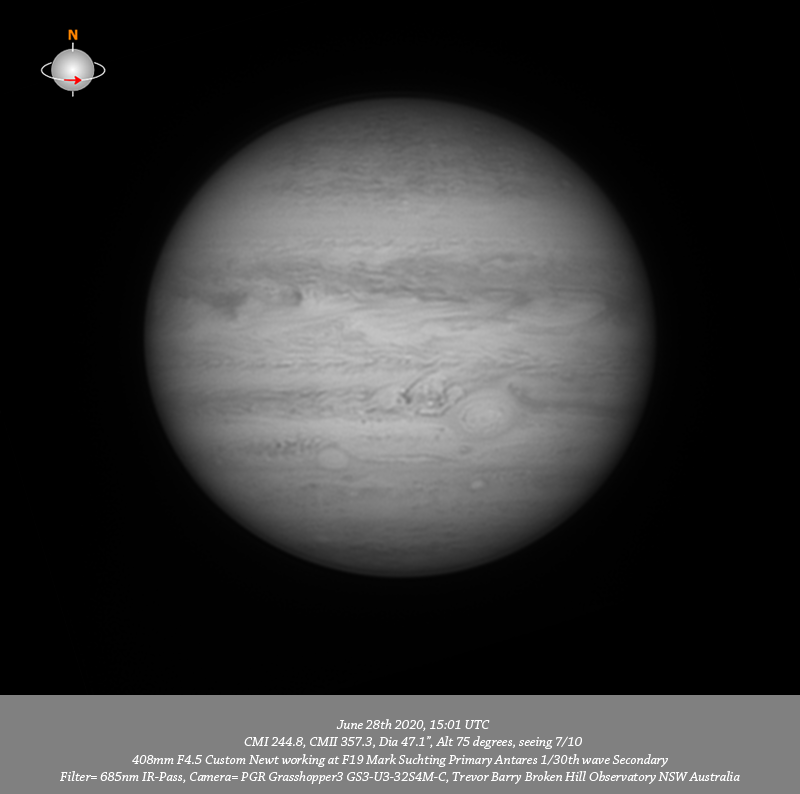 Imaged Jupiter June 28th in good seeing but initially poor transparency with all of the Ch4 and some of the 685nm IR data captured through cloud which was moving through quite quickly. That said the 685nm IR data is very good with an excellent depth of quite intricate detail resolved pole to pole and limb to limb. The NEB has considerable fine structure resolved in it while the fine structure resolved within the EZ is exquisite. The SEB structure following the GRS looks particularly interesting, circulation within the GRS is seen and the GRS chimney is open. Two tiny dark spots below and to the F side of the GRS are well resolved as is the dark elongated spot below the GRS in the STZ. Oval BA is well resolved as is the zigzag structure following it. Two small dark spots are seen below Oval BA with one leading and the other trailing it; a small bright oval is well resolved in the SSTB below the GRS. The R, G & B data was not affected by cloud, the R channel resolves all detail described for the IR as does the RGB data other than for the very fine structure seen in the EZ in the IR & R data. Regards Trevor