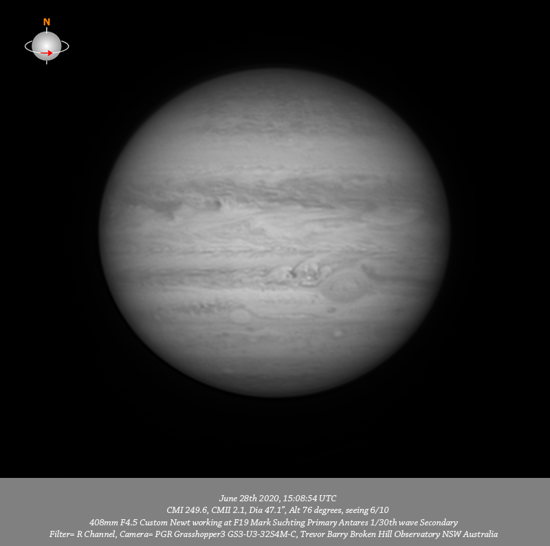 Imaged Jupiter June 28th in good seeing but initially poor transparency with all of the Ch4 and some of the 685nm IR data captured through cloud which was moving through quite quickly. That said the 685nm IR data is very good with an excellent depth of quite intricate detail resolved pole to pole and limb to limb. The NEB has considerable fine structure resolved in it while the fine structure resolved within the EZ is exquisite. The SEB structure following the GRS looks particularly interesting, circulation within the GRS is seen and the GRS chimney is open. Two tiny dark spots below and to the F side of the GRS are well resolved as is the dark elongated spot below the GRS in the STZ. Oval BA is well resolved as is the zigzag structure following it. Two small dark spots are seen below Oval BA with one leading and the other trailing it; a small bright oval is well resolved in the SSTB below the GRS. The R, G & B data was not affected by cloud, the R channel resolves all detail described for the IR as does the RGB data other than for the very fine structure seen in the EZ in the IR & R data. Regards Trevor