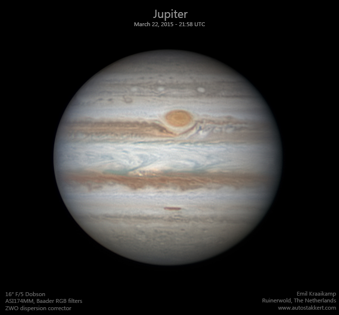 Test upload of Jupiter under good seeing conditions from the Netherlands using a 16" Dobson and a monochrome camera + Baader RGB filters. Processing with AutoStakkert!2, WinJupos and Photoshop. Time is mean exposure time of integrated GREEN channel (using best 50% of frames per channel). The image stacks (only the stacks) were derotated using winjupos to the (mean) time of the green channel . Not sure about the plate scale, so I basically just put a number there. (... should be easy to figure out later on; apparent size of Jupiter in arcsecs / size of Jupiter in number of pixels.... )