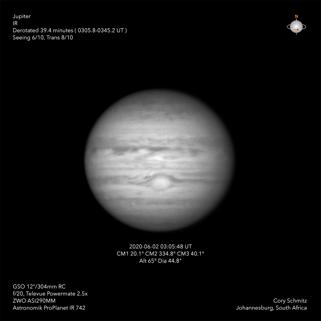 Observer: Cory Schmitz 2020/06/02 03:05:48(UT) CM1=20.1 12" / 304mm RC : ZWO ASI290MM + IR 742 filter Seeing 6/10 Trans 8/10 Comments: Seeing conditions were all over the place this morning. The intent of the timing was to shoot the Juno PJ27 track just a few hours prior to Juno PJ27.