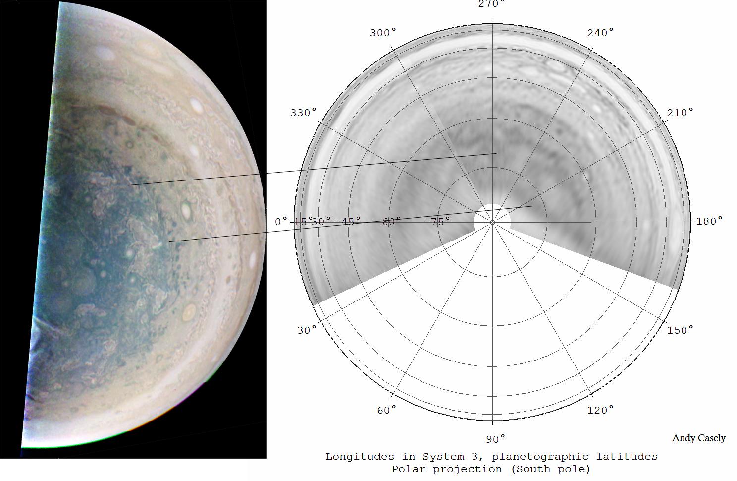 South polar map in IR642nm from three frames (08:16, 09:12, 10:41UT). Comparison with PJ14 outbound image, two of the large polar FFRs are identifiable, though the shape has changed a little during the 5 days in between