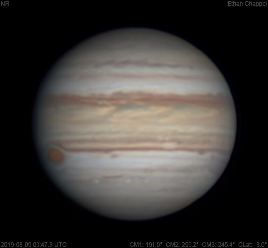 A decent night for imaging Jupiter. The area of the impact from two nights before is not visible, but no scar was left behind. Notes: White Oval Z almost blends in with the North Tropical Zone. The Equatorial Zone is still orange. The Great Red Spot is rising.