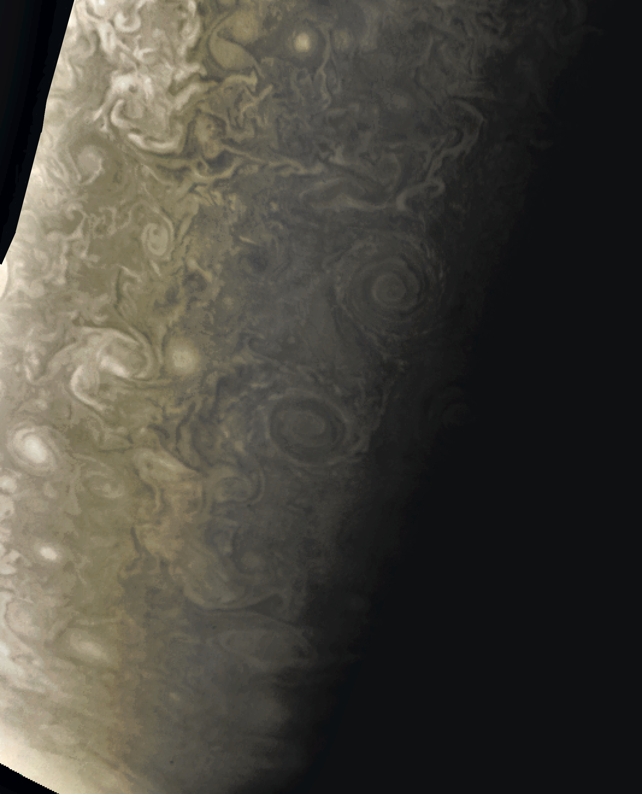 Junocam pixels are 12 bits deep from the camera but are converted to 8 bits inside the instrument using a lossless "companding" table, a process similar to gamma correction, to reduce their size. All Junocam products on the missionjuno website are in this 8-bit form as received on Earth. Scientific users interested in radiometric analysis should use the "RDR" data products archived with the Planetary Data System, which have been converted back to a linear 12-bit scale.