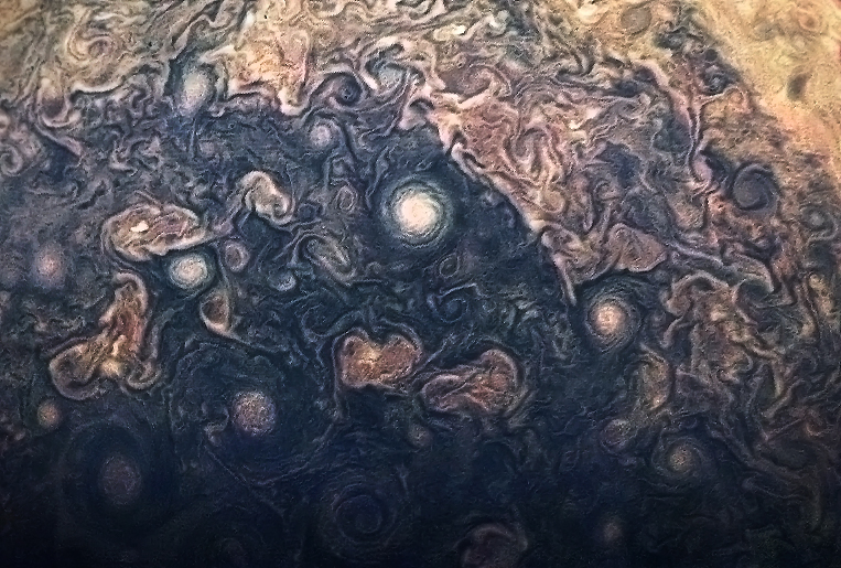 Extended-color image of swirling storms on Jupiter's South Pole, imaged by Juno on March 27, 2017 (P5).