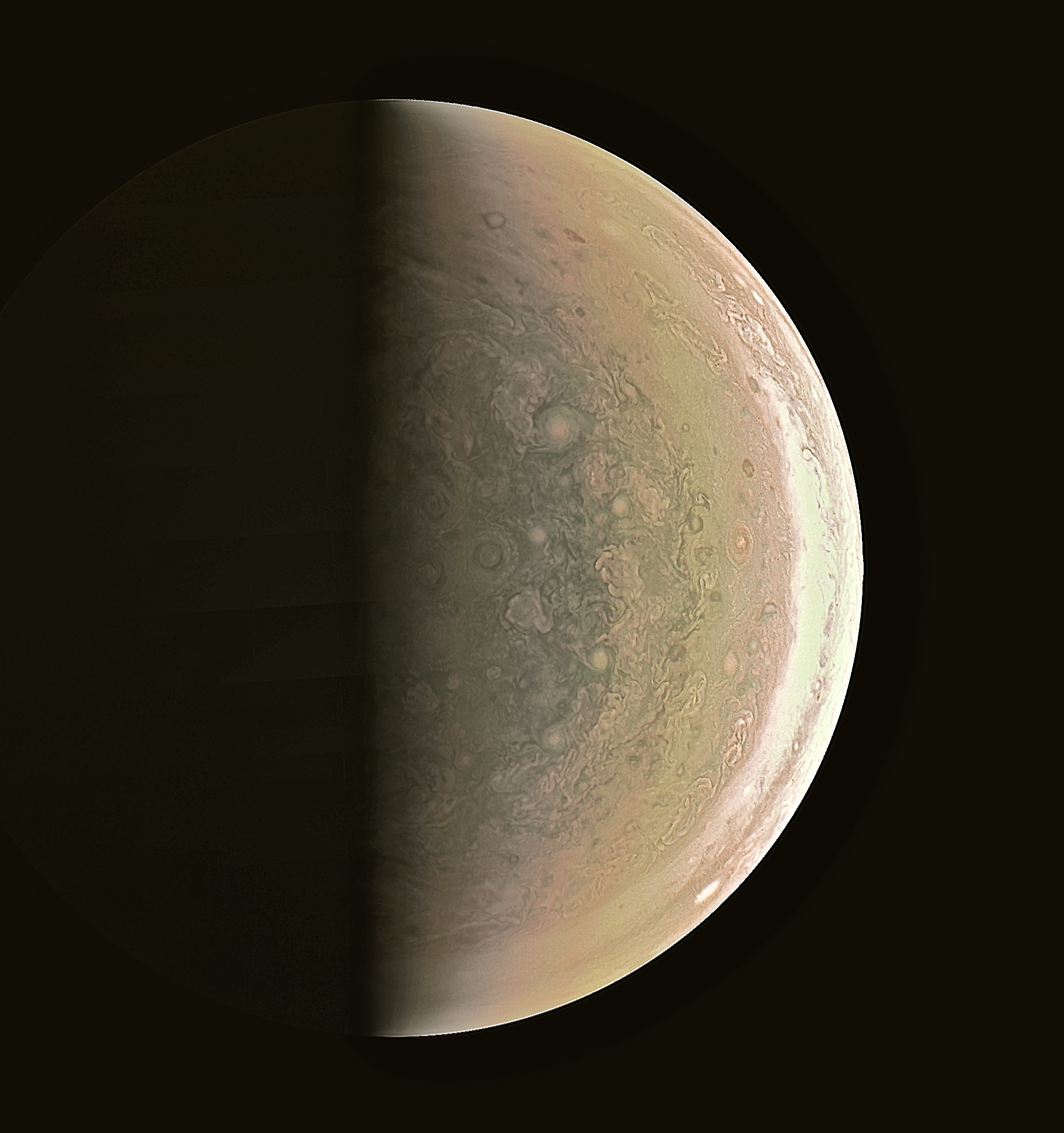 Junocam pixels are 12 bits deep from the camera but are converted to 8 bits inside the instrument using a lossless "companding" table, a process similar to gamma correction, to reduce their size. All Junocam products on the missionjuno website are in this 8-bit form as received on Earth. Scientific users interested in radiometric analysis should use the "RDR" data products archived with the Planetary Data System, which have been converted back to a linear 12-bit scale.
