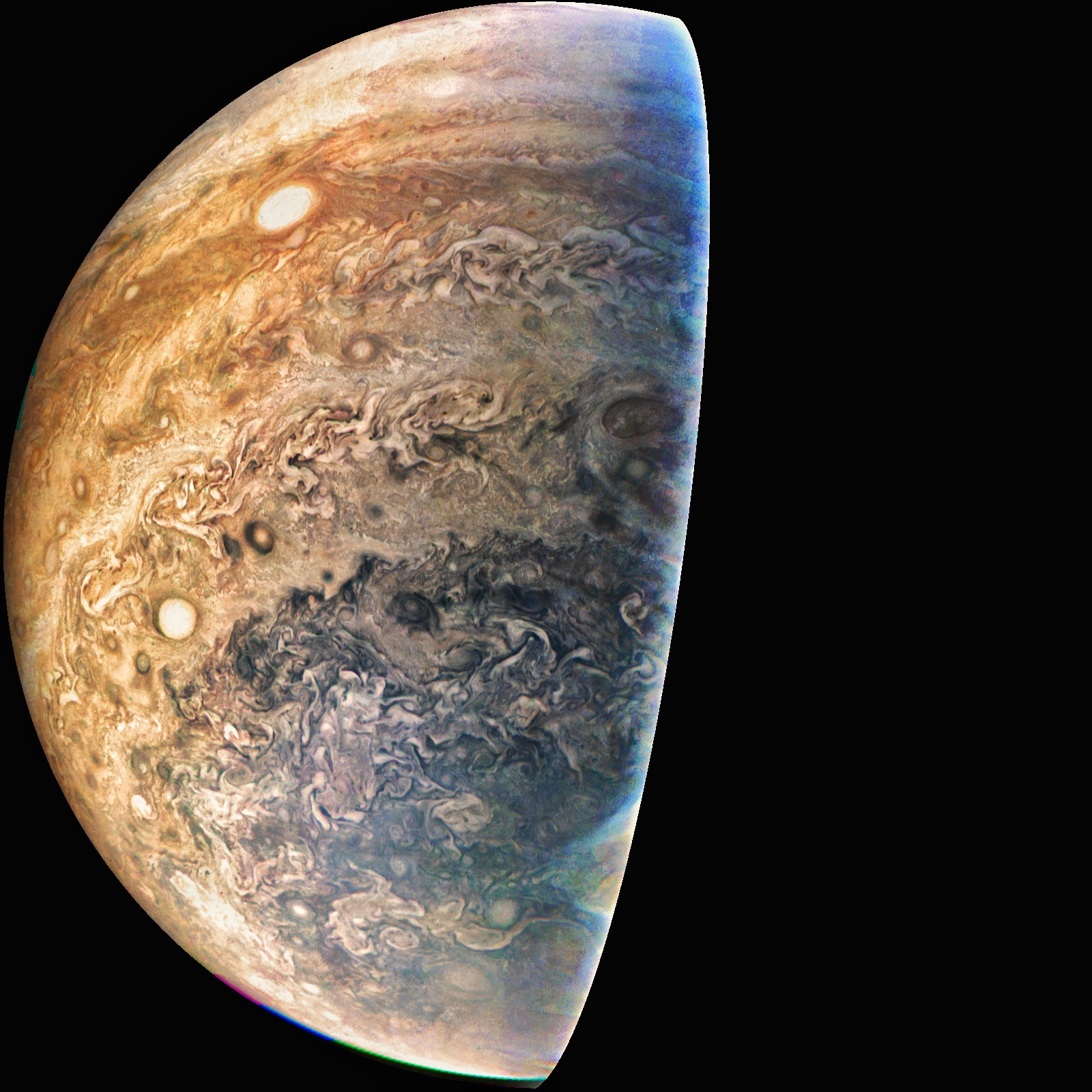 Junocam pixels are 12 bits deep from the camera but are converted to 8 bits inside the instrument using a lossless "companding" table, a process similar to gamma correction, to reduce their size. All Junocam products on the missionjuno website are in this 8-bit form as received on Earth. Scientific users interested in radiometric analysis should use the "RDR" data products archived with the Planetary Data System, which have been converted back to a linear 12-bit scale.