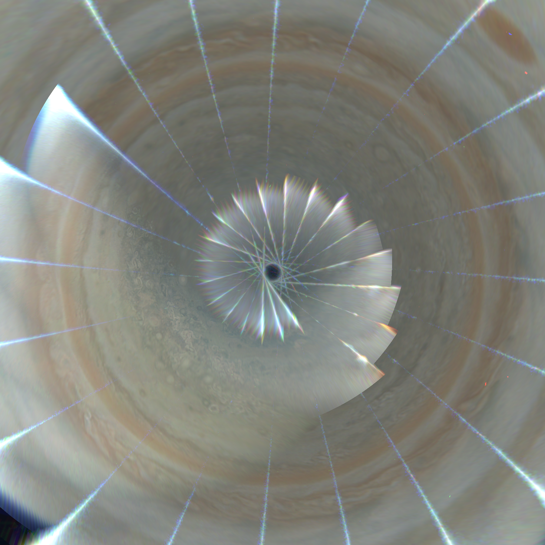 During Perijove-05 approach, JunoCam took one RGB image each half an hour. Since Jupiter rotates once each about 10 hours, a sequence of 20 JunoCam approach images covers one Jupiter rotation. Currently, there is winter on Jupiter's northern hemisphere. This leaves the north pole in the dark. The merged deLambertianed polar projections of such a 20 images sequence therefore leave a dark spot around the north pole. DeLambertianing is a crude method to adjust for brightness variations induced by the solar incidence angle varying over the illuminated surface of Jupiter. Jupiter's twilight zone is brighter than this simple model predicts. This results in an overenhancement of the twilight zone. The merged polar map covers 20 such overenhanced twilight zones, summing up to a nice spiral pattern, as Juno's perspective grows more and more north polar during approach.