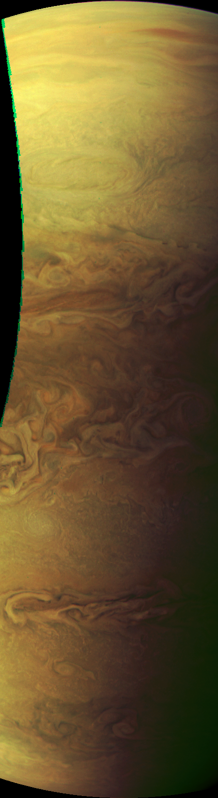 Junocam pixels are 12 bits deep from the camera but are converted to 8 bits inside the instrument using a lossless "companding" table, a process similar to gamma correction, to reduce their size. All Junocam products on the missionjuno website are in this 8-bit form as received on Earth. Scientific users interested in radiometric analysis should use the "RDR" data products archived with the Planetary Data System, which have been converted back to a linear 12-bit scale.
