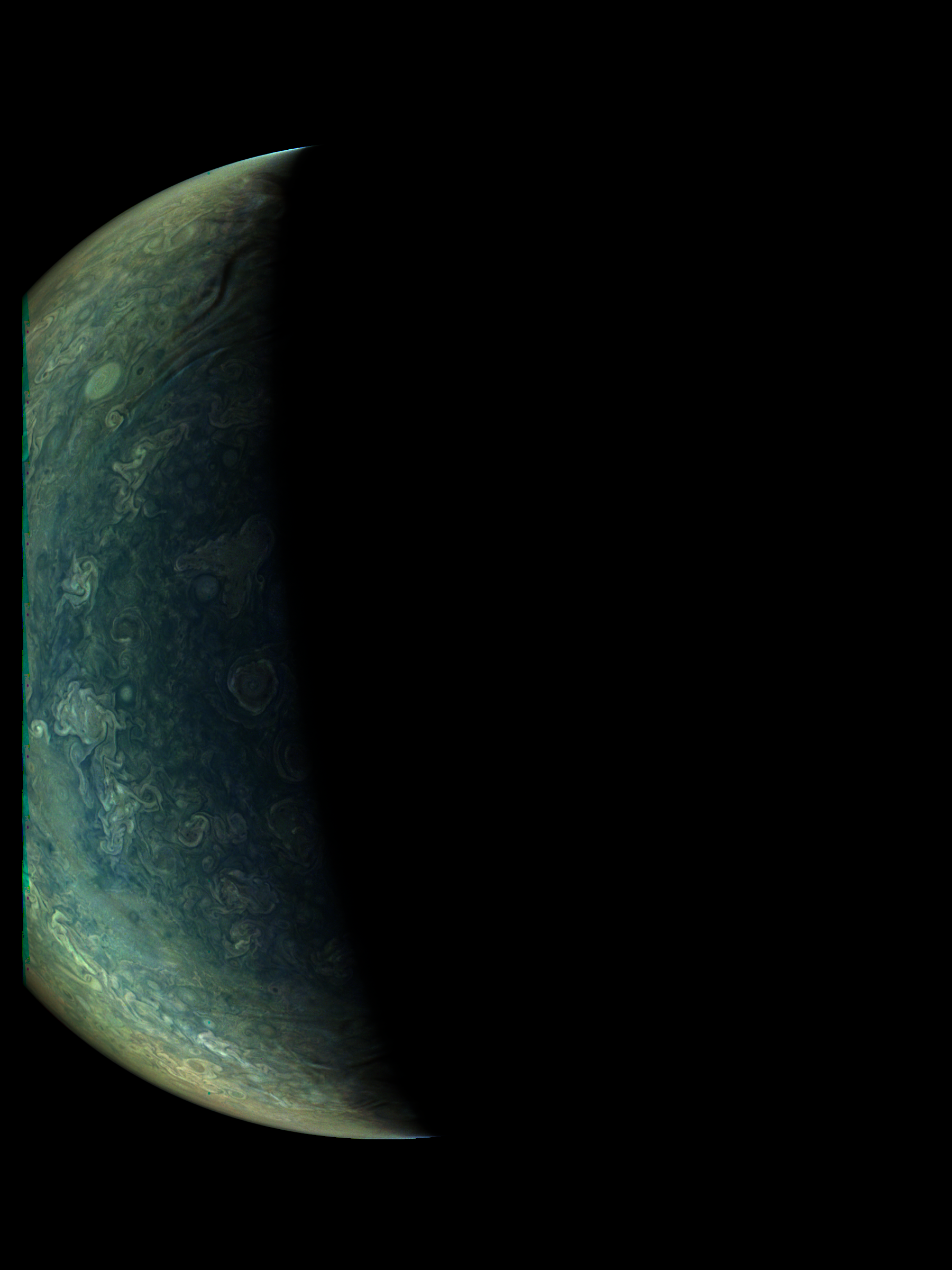 The image shows Jupiter from the north. It's mostly illumination adjusted, then strongly enhanced by using the 4th power of radiometric data. Then some illumination effect is added again in order to recover the 3D appearence. The resolution of the image is similar to JunoCam's resolution.