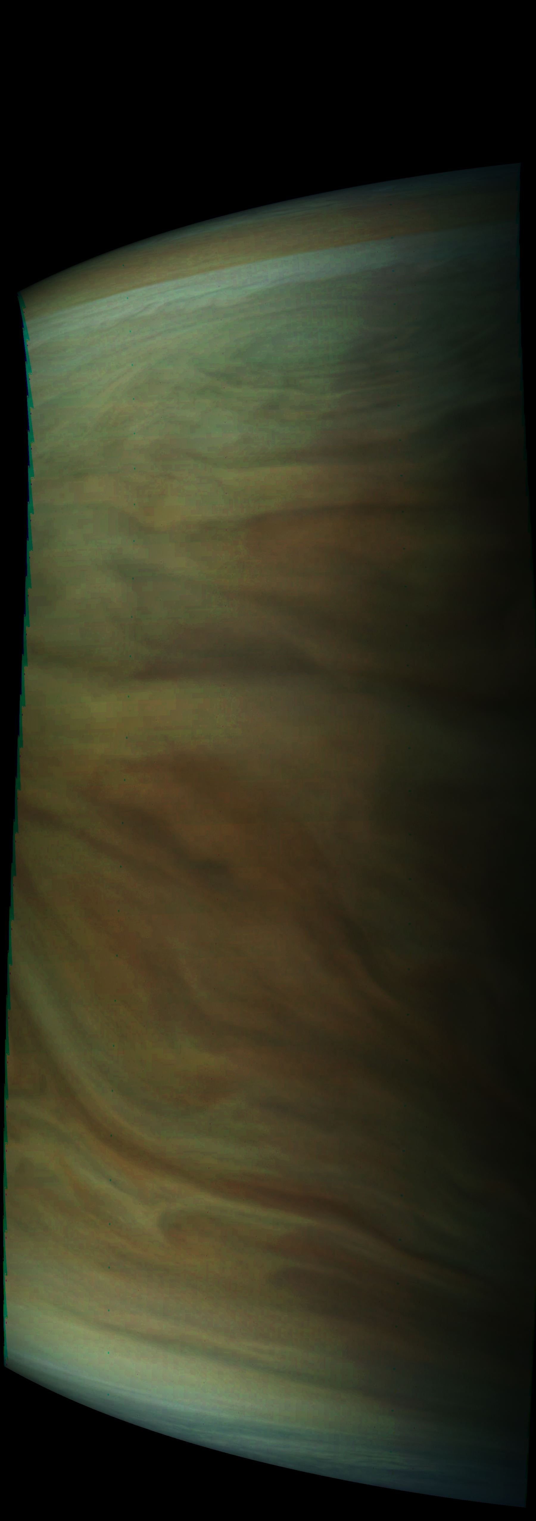 Junocam pixels are 12 bits deep from the camera but are converted to 8 bits inside the instrument using a lossless "companding" table, a process similar to gamma correction, to reduce their size. All Junocam products on the missionjuno website are in this 8-bit form as received on Earth. Scientific users interested in radiometric analysis should use the "RDR" data products archived with the Planetary Data System, which have been converted back to a linear 12-bit scale.