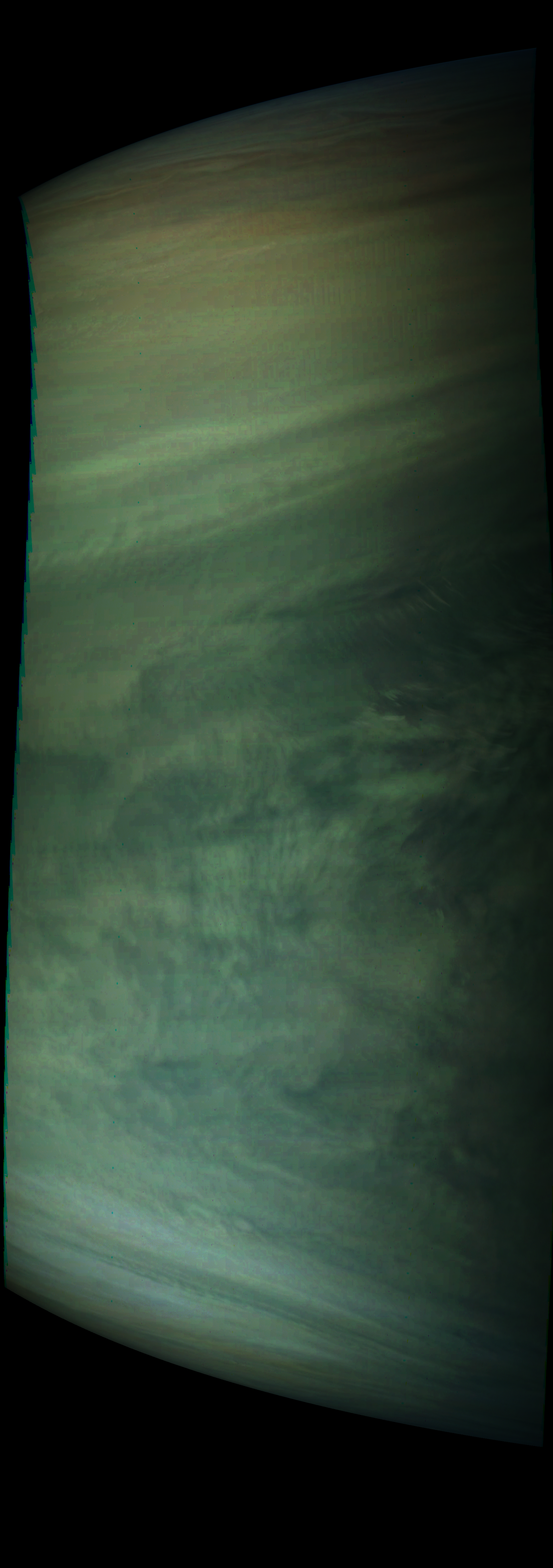 Junocam pixels are 12 bits deep from the camera but are converted to 8 bits inside the instrument using a lossless "companding" table, a process similar to gamma correction, to reduce their size. All Junocam products on the missionjuno website are in this 8-bit form as received on Earth. Scientific users interested in radiometric analysis should use the "RDR" data products archived with the Planetary Data System, which have been converted back to a linear 12-bit scale.