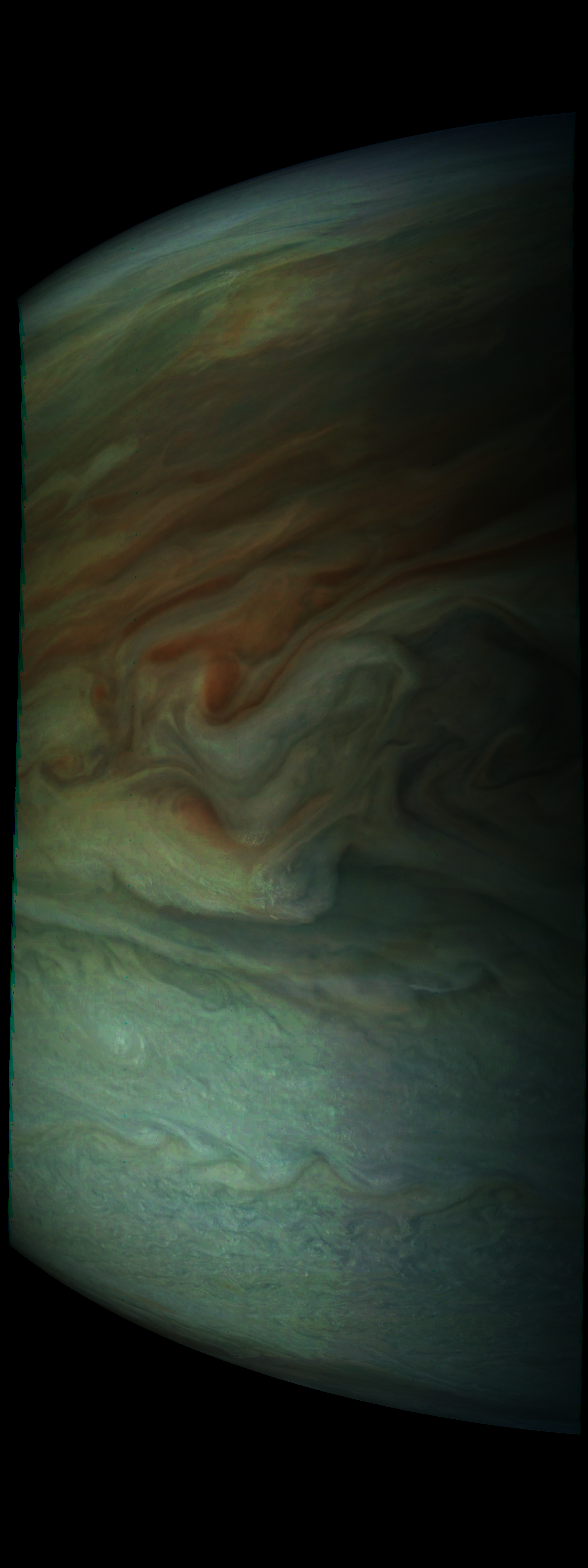 The image is mostly illumination adjusted, then strongly enhanced by using the 4th power of radiometric data. Then some illumination effect is added again in order to recover the 3D appearence. The resolution of the image is similar to JunoCam's resolution.