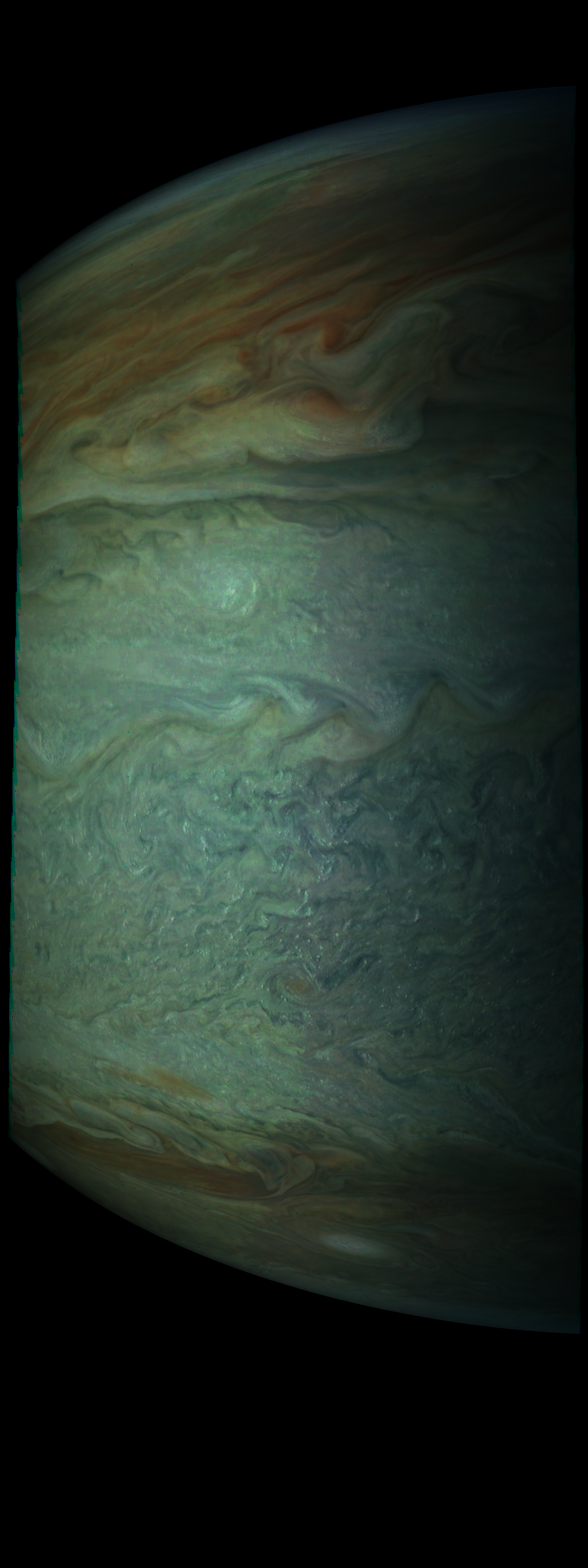 Junocam pixels are 12 bits deep from the camera but are converted to 8 bits inside the instrument using a lossless "companding" table, a process similar to gamma correction, to reduce their size. All Junocam products on the missionjuno website are in this 8-bit form as received on Earth. Scientific users interested in radiometric analysis should use the "RDR" data products archived with the Planetary Data System, which have been converted back to a linear 12-bit scale.