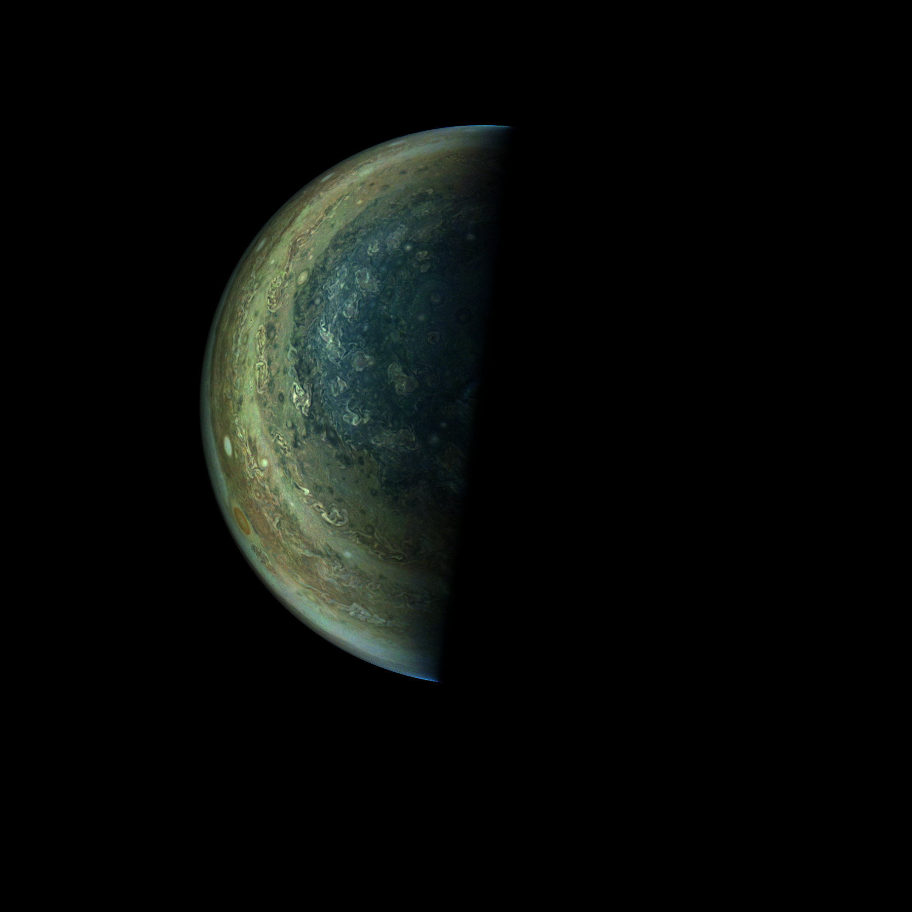 The image is rendered directly from the raw image. Resolution is 30 pixels per degree in a spherical coordinate system, as seen from JunoCam at image stop time.