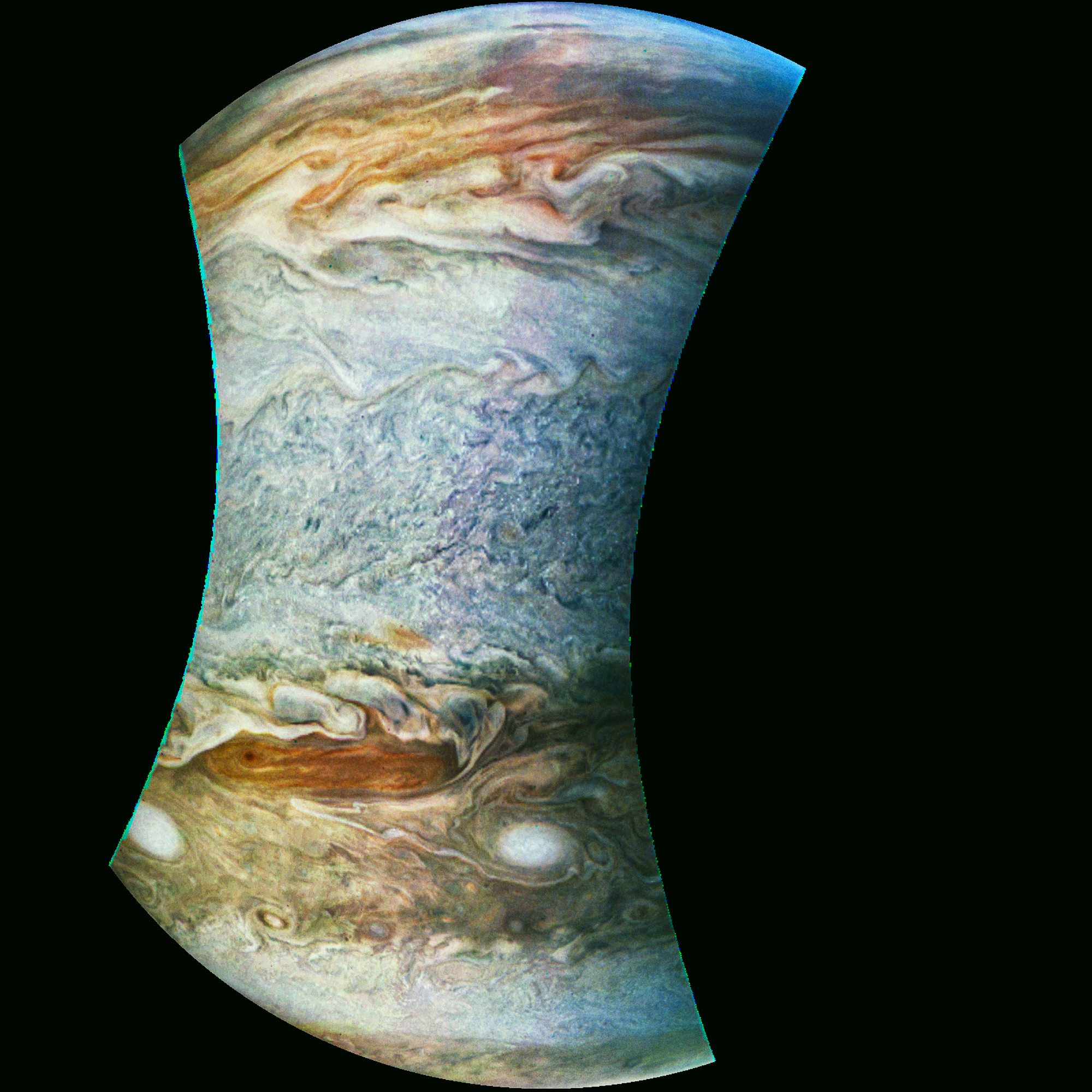 Junocam pixels are 12 bits deep from the camera but are converted to 8 bits inside the instrument using a lossless "companding" table, a process similar to gamma correction, to reduce their size. All Junocam products on the missionjuno website are in this 8-bit form as received on Earth. Scientific users interested in radiometric analysis should use the "RDR" data products archived with the Planetary Data System, which have been converted back to a linear 12-bit scale.