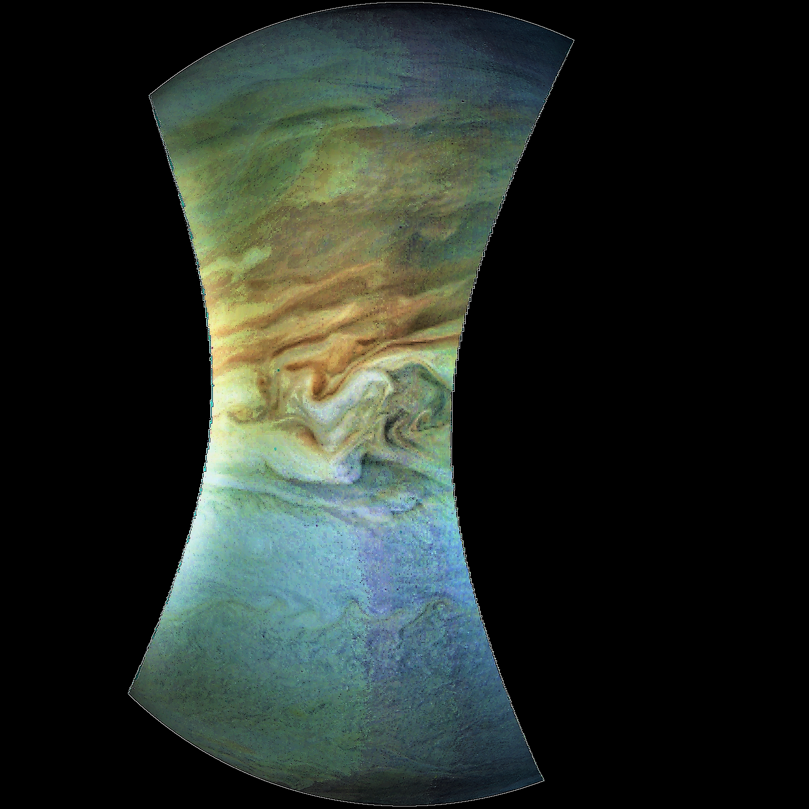 Junocam pixels are 12 bits deep from the camera but are converted to 8 bits inside the instrument using a lossless "companding" table, a process similar to gamma correction, to reduce their size. All Junocam products on the missionjuno website are in this 8-bit form as received on Earth. Scientific users interested in radiometric analysis should use the "RDR" data products archived with the Planetary Data System, which have been converted back to a linear 12-bit scale.