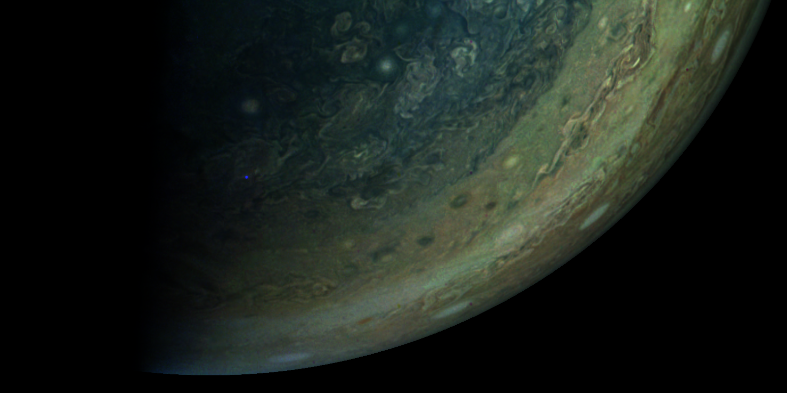 This is a approximately 2-fold supersampled, reprojected, and strongly enhanced version of PJ06 image #133. Enhancement is with 4th power of radiometric values after approximate illumnination adjustment. This way, a pale blue dot in the southern FFRs on the day side near the terminator pops up as a distinct blue spot. It's not obviously a member of repetitive camera artifacts. And it's rather pale, and larger than a pixel, not very tyoical for an energetic particle event. So, it might be a true event on Jupiter, either an impact or a lightning. FFRs are known for occasional lighnings. So this bluish spot might be considered as a lightning candidate.
