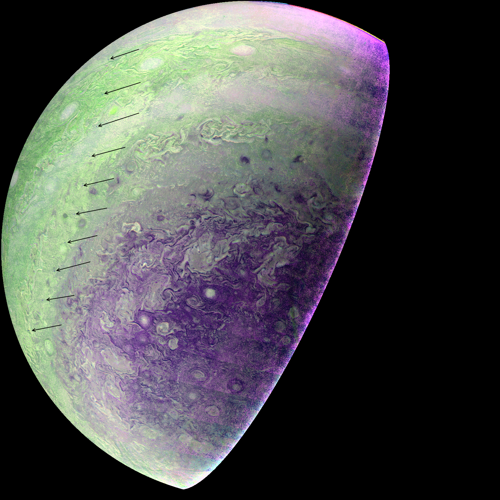 Junocam pixels are 12 bits deep from the camera but are converted to 8 bits inside the instrument using a lossless "companding" table, a process similar to gamma correction, to reduce their size. All Junocam products on the missionjuno website are in this 8-bit form as received on Earth. Scientific users interested in radiometric analysis should use the "RDR" data products archived with the Planetary Data System, which have been converted back to a linear 12-bit scale.