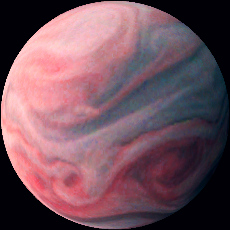 Junocam pixels are 12 bits deep from the camera but are converted to 8 bits inside the instrument using a lossless "companding" table, a process similar to gamma correction, to reduce their size. All Junocam products on the missionjuno website are in this 8-bit form as received on Earth. Scientific users interested in radiometric analysis should use the "RDR" data products archived with the Planetary Data System, which have been converted back to a linear 12-bit scale.