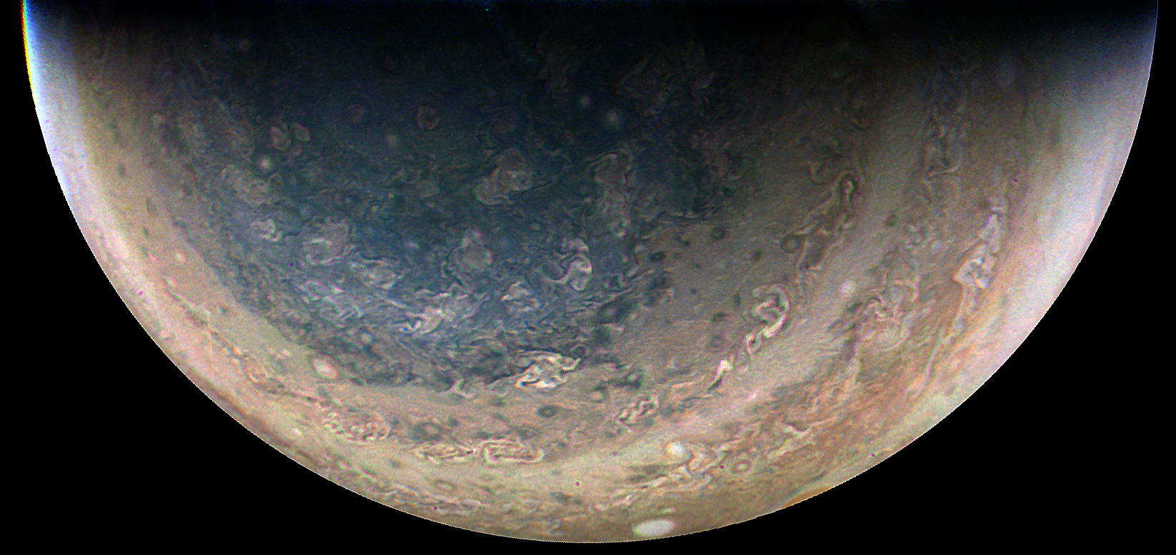 Junocam pixels are 12 bits deep from the camera but are converted to 8 bits inside the instrument using a lossless "companding" table, a process similar to gamma correction, to reduce their size. All Junocam products on the missionjuno website are in this 8-bit form as received on Earth. Scientific users interested in radiometric analysis should use the "RDR" data products archived with the Planetary Data System, which have been converted back to a linear 12-bit scale.