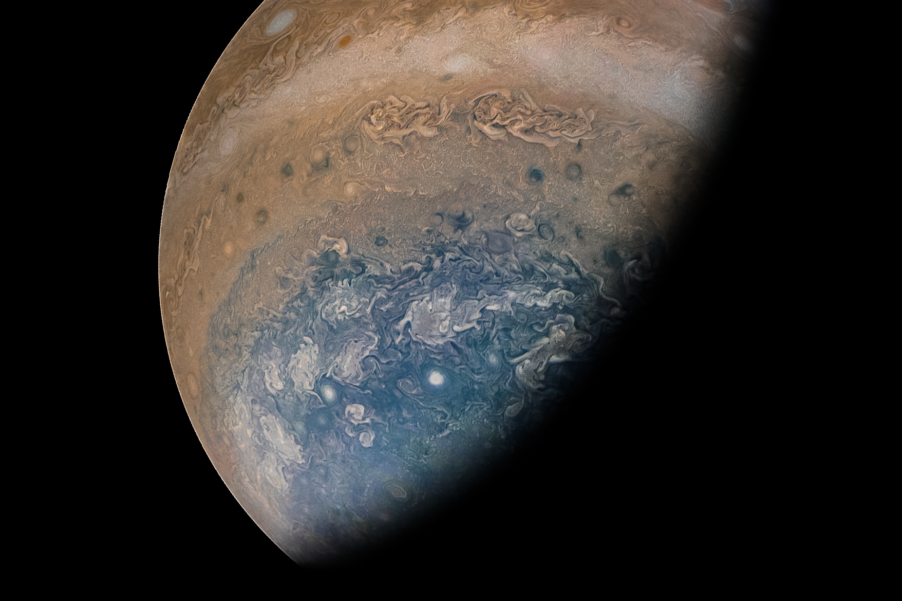 Post-processing and colour enhancing brings out the dark blue southern region of Jupiter.