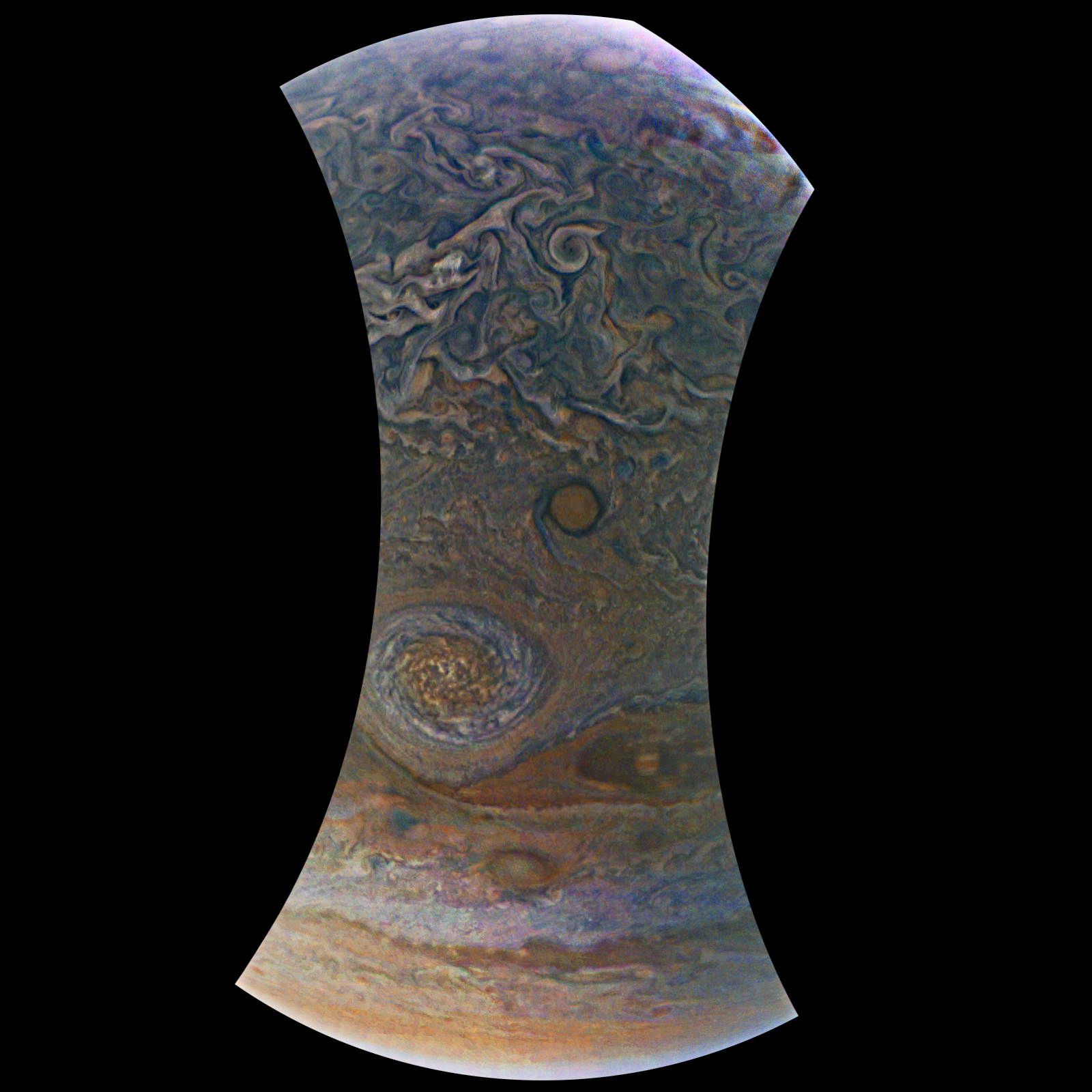 Junocam pixels are 12 bits deep from the camera but are converted to 8 bits inside the instrument using a lossless "companding" table, a process similar to gamma correction, to reduce their size. All Junocam products on the missionjuno website are in this 8-bit form as received on Earth. Scientific users interested in radiometric analysis should use the "RDR" data products archived with the Planetary Data System, which have been converted back to a linear 12-bit scale.