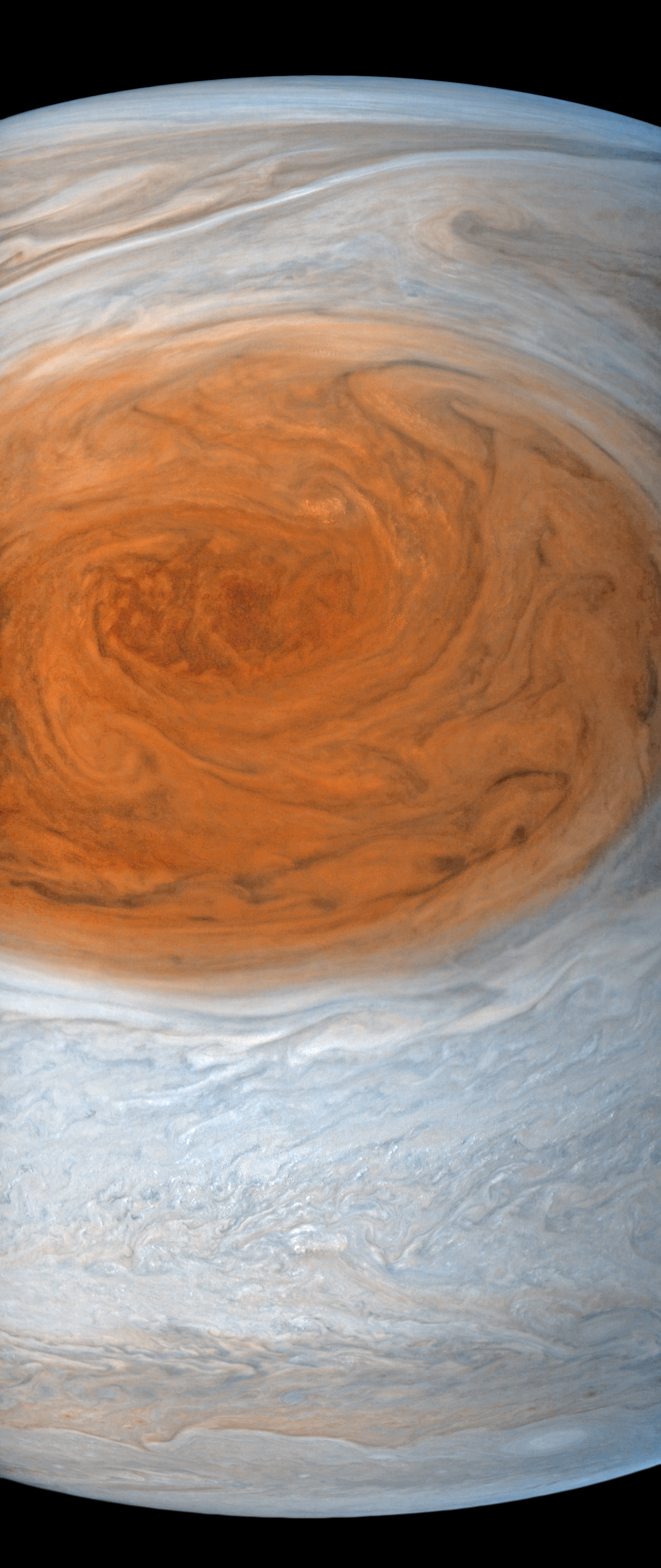 Processed version of the Great Red Spot image taken near closest approach to the feature (alt ~9900 km) with moderate contrast enhancement and white balancing.